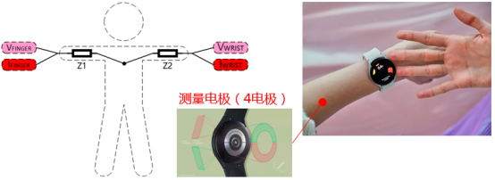 可(kě)穿戴設備的人(rén)體(tǐ)阻抗測量可(kě)簡化成節段模型。IFINGER、IWRIST爲激勵電流端,VFINGER、VWRIST爲電壓測量端(等效電路(lù)見(jiàn) 下文圖片)。穿戴設備産品(例如(rú)智能手表)形态一般是測量上肢阻抗。