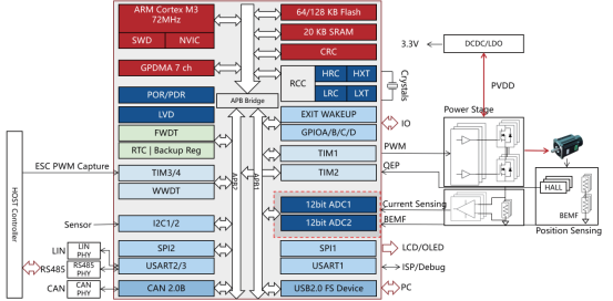 CS32F103系列憑借高度集成特性,支持終端應用根據具體(tǐ)需求開發電機(jī)控制的定制算法,可(kě)以使電機(jī)驅動器更好地管理(lǐ)電機(jī)故障檢測等關鍵功能,同時實施保護機(jī)制,從(cóng)而提高系統可(kě)靠性。