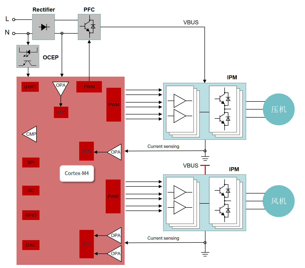 使用一顆MCU實現系統控制、壓縮機(jī)變頻控制、風(fēng)機(jī)變頻控制和主動PFC算法,因而這顆MCU需要具備極高的算力、功能強大(dà)的模拟和數字外設(ADC, 電機(jī)專用PWM定時器,運算放(fàng)大(dà)器,DMA等),以及足夠的Memory存儲空間。作(zuò)爲大(dà)白(bái)電領域的旗幟性應用,變頻空調的工(gōng)作(zuò)環境相(xiàng)當惡劣,這對MCU的可(kě)靠性提出了極高的要求。芯海科(kē)技作(zuò)爲模拟起家,數模混合領域的領跑者,有志于設計(jì)出可(kě)靠性高的變頻空調專用SoC