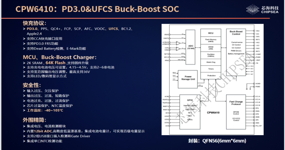 CPW6410是一款集成PD3.1及UFCS等多種快(kuài)充協議(yì)、高性能MCU、同步雙向升降壓管理(lǐ)、锂電池充電管理(lǐ)的快(kuài)充電源管理(lǐ)SOC芯片,專門(mén)針對USB Type-C PD快(kuài)充電源應用提供整體(tǐ)解決方案。