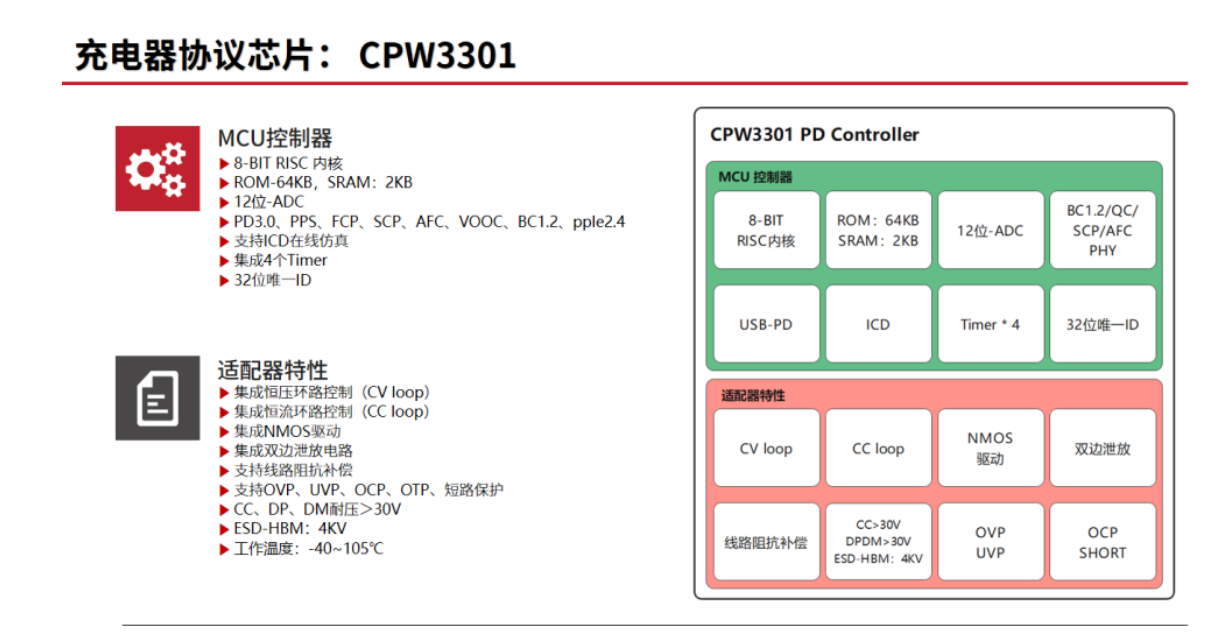 CPW3301不僅集成了電源控制模塊和快(kuài)充協議(yì)模塊,肩負了整個快(kuài)充過程的核心任務,同時還(hái)專門(mén)解決了目前市場上電源适配器的一系列痛點。