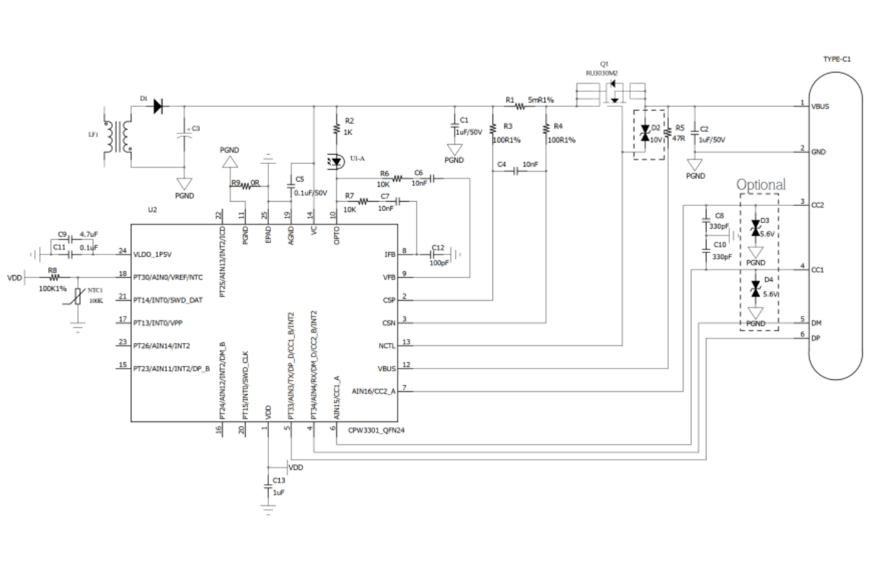 最後,CPW3301兼顧高安全設計(jì)。産品内置了12位ADC,以支持OVP、UVP、OCP、