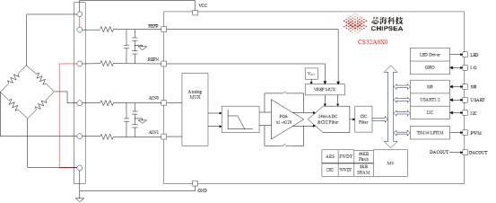 CS32A0X0内置低噪聲PGA(支持x1~x128增益),輸入阻抗可(kě)以達到G歐級别,同時内置最高22位ENOB的24位Σ-ΔADC,支持單周期穩定建立,支持50-60Hz工(gōng)頻幹擾抑制,最多支持4通道橋式差分(fēn)信号檢測,是工(gōng)業測量的最佳選擇,内置溫度傳感器加上32位MCU可(kě)以用做溫度補償,進一步提高系統精度。
