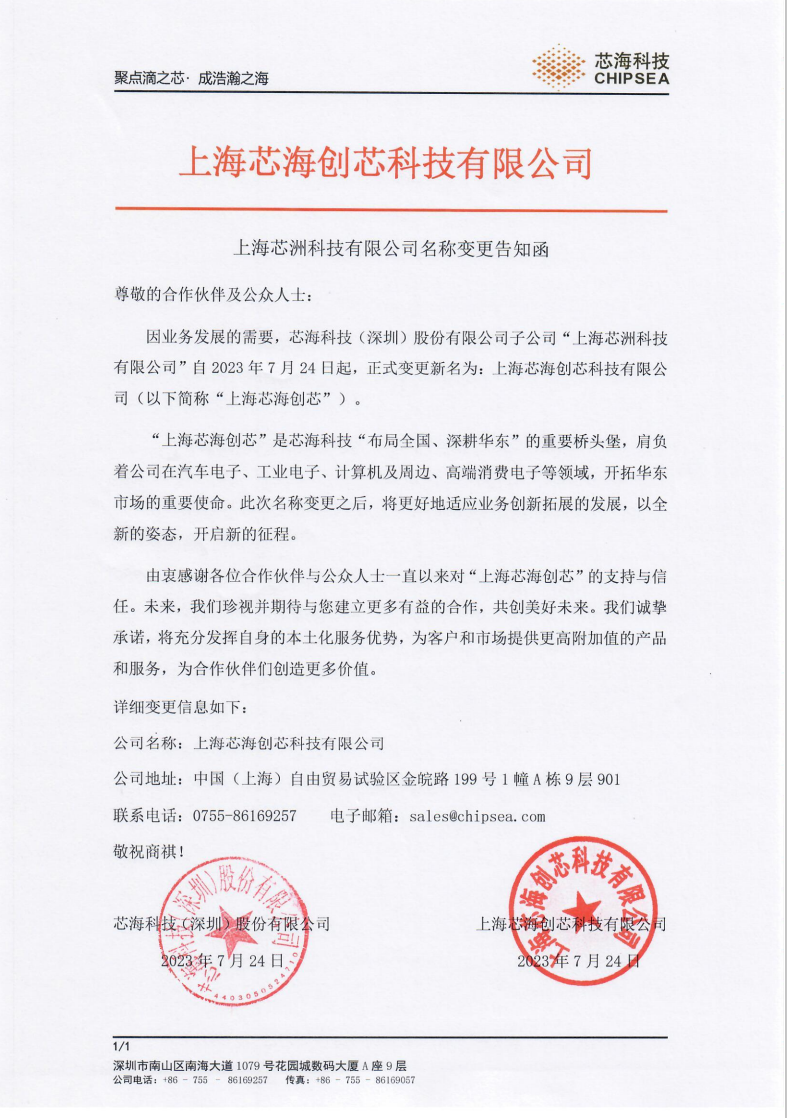 上海芯洲科(kē)技有限公司名稱變更告知函